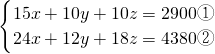 某步行街摆放有若干盆甲、乙、丙三种造型的盆景.甲种盆景由15朵红花、24朵黄花和25朵紫花搭配而成.乙种盆景由10朵红花、12朵黄花搭配而成.丙种盆景由10朵红花、18朵黄花和25朵紫花搭配而成.这些盆景一共用了2900朵红花,3750朵紫花,则黄花一共用了 朵.