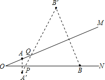 分析:分别作出点A、点B关于ON、OM的对称点A'、B',连接A'、B',交OM、ON分别于Q、P两点,则P、Q为所求作的两点,将三条线段转化到一条线段上去即可.