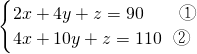 分析:设甲一件x元、乙一件y元、丙一件z元,则根据购甲2件、乙4件、丙1件,共需90元可得2x+4y+z=90,根据购甲4件、乙10件、丙1件,共需110元可得,联立方程组可得出x+y+z的值.