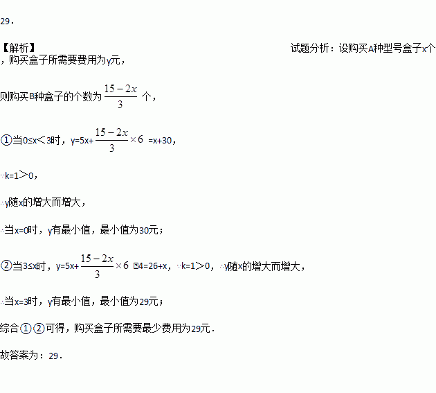 一食堂需要购买盒子存放食物,盒子有A、B两种型号,单个盒子的容量和价格如表格所示.现有15升食物需要存放且要求每个盒子都要装满,由于A型号盒子正做促销活动:购买三个及三个以上可一次性每个返还现金1.5元,则该食堂购买盒子所需最少费用是__________.