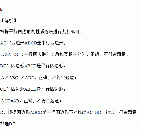 如图所示,在平行四边形ABCD中,对角线AC、BD相交于点O,则下列结论中错误的是( )