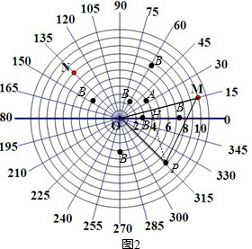 分析 (1)根据坐标中的第一个数值表示到O点距离,第二个数表示这点与正东方向的夹角,利用此方法写出点N、王家庄和点P的坐标;