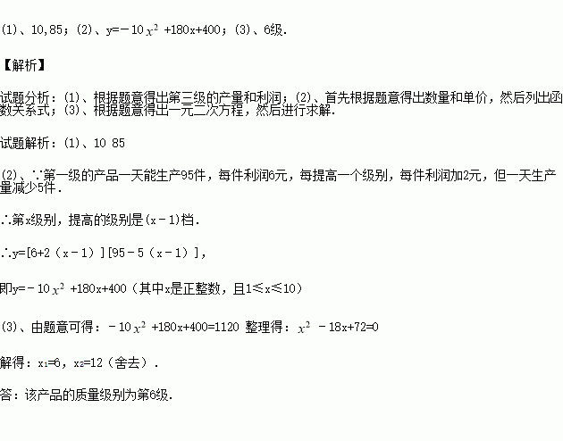 某工厂生产的某种产品按质量分为10个等级.第1级(最低级)产品每天能生产95件,每件利润6元.已知每提高一个级别,每件利润增加2元,但每天产量减少5件.