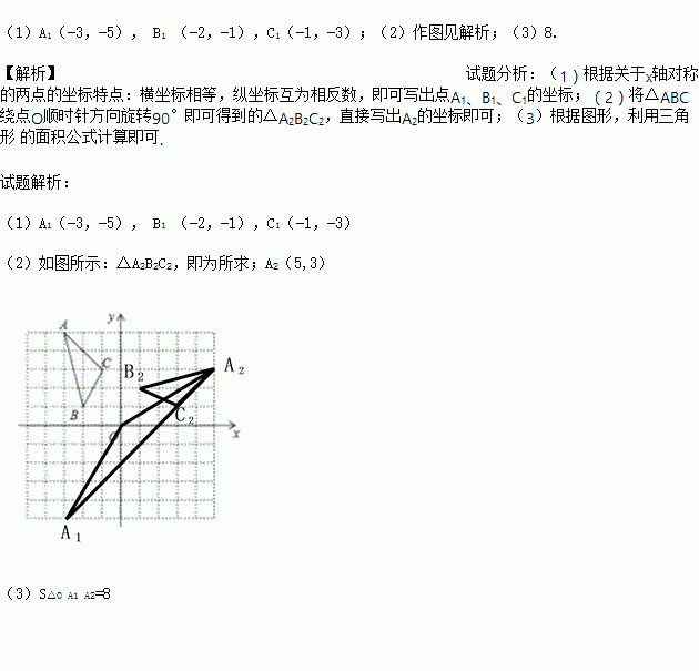 ⑵将△ABC绕点O按顺时针方向旋转90°得到△A2B2C2,画出△A2B2C2,并写出点A的对称点A2的坐标;
