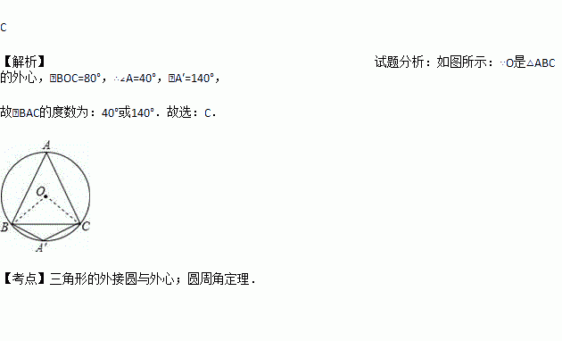点O是△ABC的外心,若∠BOC=80°,则∠BAC的度数为( )