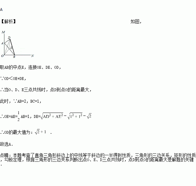 如图,∠MON=90°,直角三角形ABD的顶点A,B分别在边OM,ON上,当B在边ON上运动时,点A随之在边OM上运动, 直角三角形ABD的形状保持不变,其中AB=2,AD=1.运动过程中,点D到点O的最大距离为( )