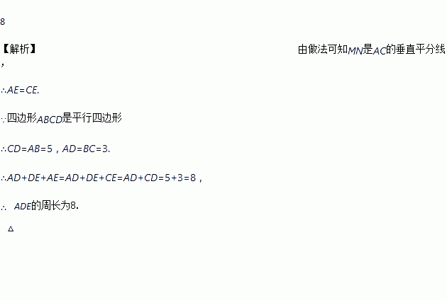 AC的长为半径画弧,两弧分别相交于点M,N,作直线MN交CD于点E,交AB于点F.若AB=5,BC=3,则△ADE的周长为__________.