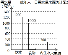 (3)用一日需水量减去饮水和内生水即为食物提供的水,然后补全统计图即可;