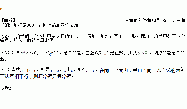 (1)三角形的外角和是180°;(2)三角形的三个内角中至少有两个锐角;