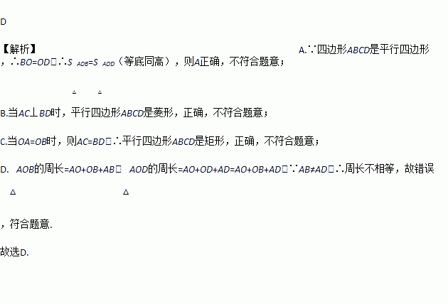 C. 当OA=OB时,它是矩形 D. △AOB的周长等于△AOD的周长