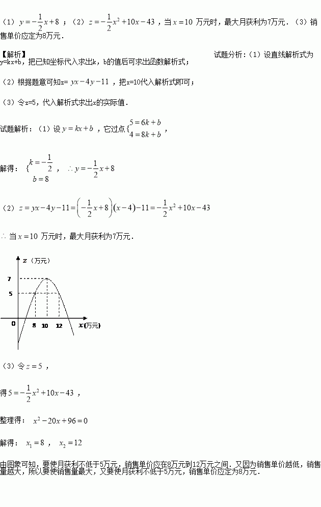 (2)试写出该公司销售该种产品的月获利z(万元)关于销售单价x(万元)的函数关系式、当销售单价x为何值时,月获利最大?并求这个最大值(月获利一月销售额一月销售产品总进价一月总开支)