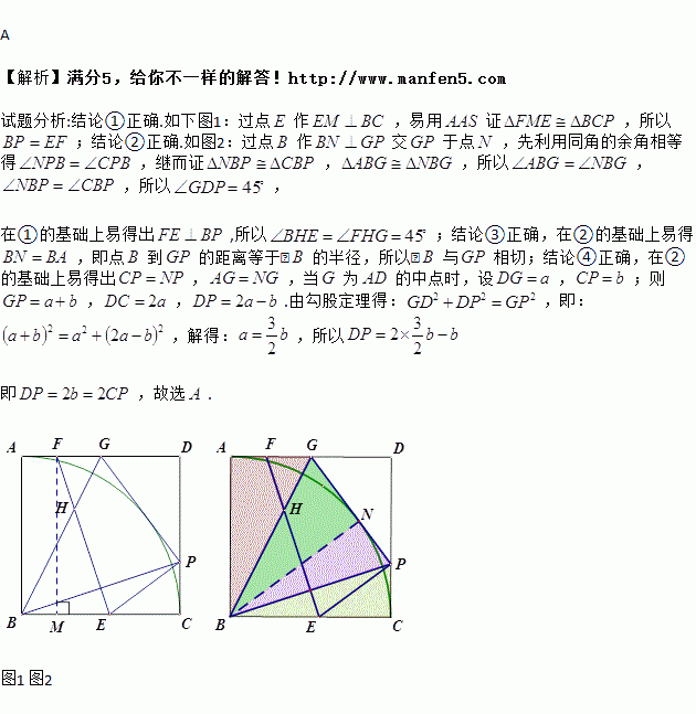 如图,点P为正方形ABCD的边CD上一点,BP的垂直平分线EF分别交BC、AD于E、F两点,GP⊥EP交AD于点G,连接BG交EF于点 H,下列结论:①BP=EF;②∠FHG=45°;③以BA为半径⊙B与GP相切;④若G为AD的中点,则DP=2CP.其中正确结论的序号是( )