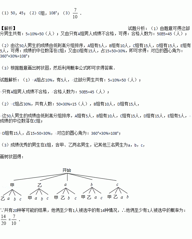 (2)这部分男生成绩的中位数落在哪一组?扇形统计图中D组对应的圆心角是多少度?