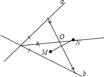 分析:(1)作出a、b两条直线的夹角平分线,再作出MN的垂直平分线,两线交点即为O;