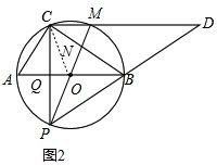 (3)连接OC,如图2.易证PM是⊙O的直径,即PM经过点O.由AQ=9,BQ=16,可求出AB、OA、OQ,根据勾股定理的逆定理可得∠CQO=90°,即可得到AB∥CD,根据平行线分线段成比例可得$\frac{CQ}{CP}=\frac{DB}{DP}$.根据垂径定理可得CQ=PQ=$\frac{1}{2}$PC,从而可得PC=2CQ=24,DB=$\frac{1}{2}$DP.由$\frac{CP}{CD}$=$\frac{CA}{CB}$=$\frac{3}{4}$可求出CD,根据勾股定理可求出PD,从而可求出DB,在Rt△PCM中运用勾股定理可求出CM.由CM∥OB可得△CNM∽△BNO,根据相似三角形的性质可求出MN.