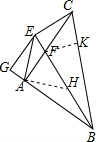 分析 过F作FK⊥BC于K,根据等腰直角三角形的性质得到∠ABC=∠ACB=45°,由等腰直角三角形性质得到CK=FK,根据角平分线的性质得到FK=AF,等量代换得到AF=CK,根据全等三角形的性质得到AB=BK,于是得到BC=BK+CK=AB+AF,故①正确,由∠BAC=∠BEC=90°,推出点A,B,C,E四点共圆,根据圆周角定理得到∠ABF=∠ACE,∠EAC=∠FBC,等量代换得到∠EAC=∠ECA,推出AE=CE,根据直角三角形的性质得到AH=BH=$\frac{1}{2}$BF,推出AE=AH=CE,于是得到BF=2CE,故②正确,根据在直角三角形中斜边大于直角边得到AE>GE,CF>CE,于是得到CF>GE,故③错误;由∠G=∠BAC=90°,推出GE∥AC根据平行线的性质得到∠AEG=∠EAC,等量代换得到∠GEA=∠CBF,故④正确.