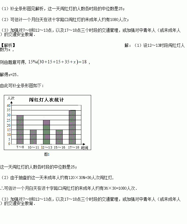 (1)若老年人这一天闯红灯人次为18人,求图1提供的五个数据(各时段闯红灯人次)的中位数并补全条形图;