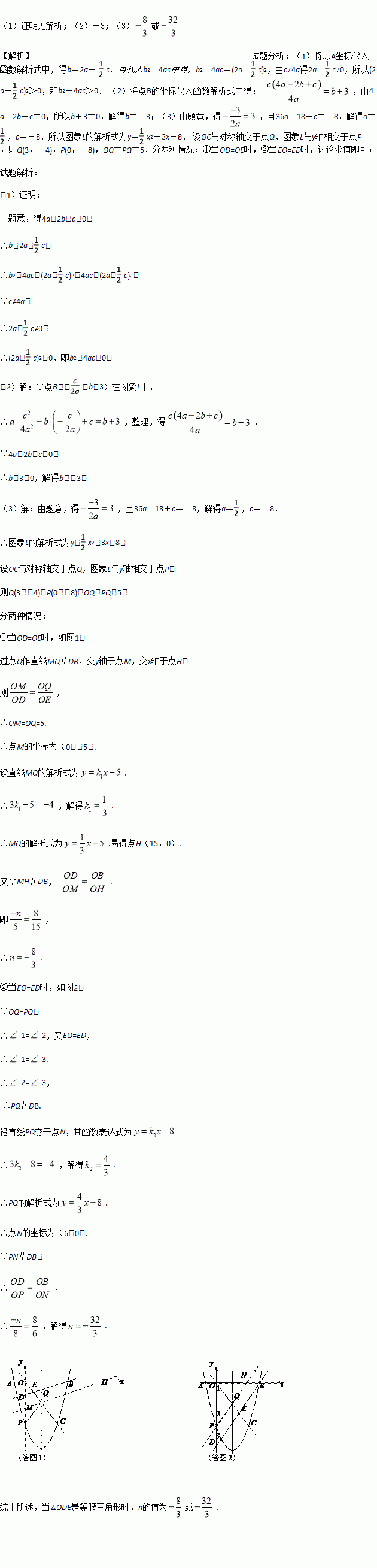 (3)在(2)的条件下,若图象L的对称轴为直线x=3,且经过点C(6,-8),点D(0,n)在y轴负半轴上,直线BD与OC相交于点E,当△ODE为等腰三角形时,求n的值.