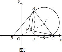 £¨3£©Èçͼ3£¬È¡ACµÄÖеãT£¬ÒÔµãTΪԲÐÄ£¬ACΪ°ë¾¶×÷Ô²£¬Á¬½ÓOT£¬½»Ô²ÓÚµãH£¬¹ýµãA¡¢T·Ö±ð×÷xÖáµÄ´¹Ïߣ¬![]()