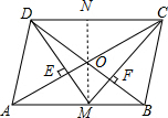分析 由平行四边形的性质得出△ODN≌△OBM,进而得出OM=ON,DN=BM,CN=AM,由DM⊥AC,CM⊥BD,可得点O是△CDM的垂心,由AM:MB=4:3得$\frac{BF}{DF}$=$\frac{BM}{CD}$=$\frac{3}{7}$,由△DON∽△MOF,得出OD•OF=OM•ON,从而得出BD=$\sqrt{10}$OM,由勾股定理可昨CD=$\frac{7}{3}$DN=$\frac{7}{3}$$\sqrt{O{D}^{2}-O{N}^{2}}$,再利用△DON∽△DCF,可求出CF的值,在RT△BCF中,利用勾股定理可得OM2=6,运用S平行四边形ABCD=CD•MN即可求解.