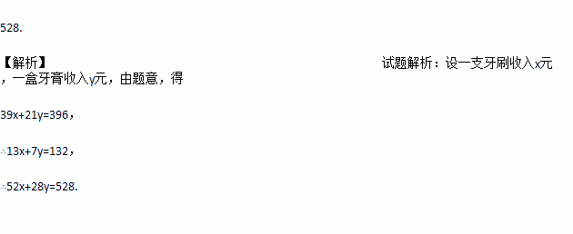 华润苏果的账目记录显示,某天卖出39支牙刷和21盒牙膏,收入396元;另一天以同样的价格卖出同样的52支牙刷和28盒牙膏,收入应该是__元.