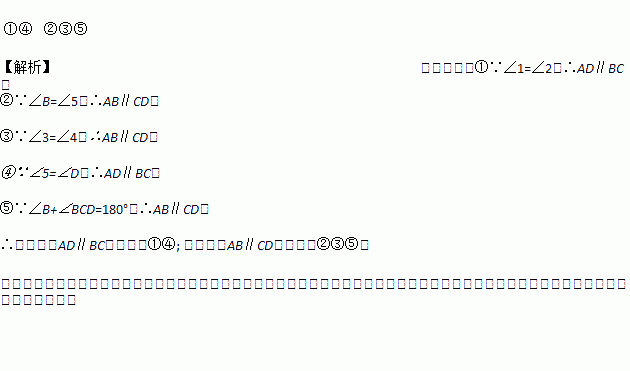 如图,现给出下列条件:①∠1=∠2,②∠B=∠5,③∠3=∠4,④∠5=∠D,⑤∠B+∠BCD=180°,其中能够得到AD∥BC的条件是___________. (填序号)能够得到AB∥CD的条件是___________.(填序号)