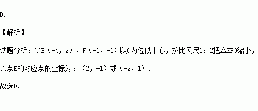 如图,在平面直角坐标系中,已知点E(-4,2)、F(-2,-2),以原点O为位似中心,相似比为2∶1,把△EFO缩小为△E′F′O,则点E的对应点E′的坐标是( )