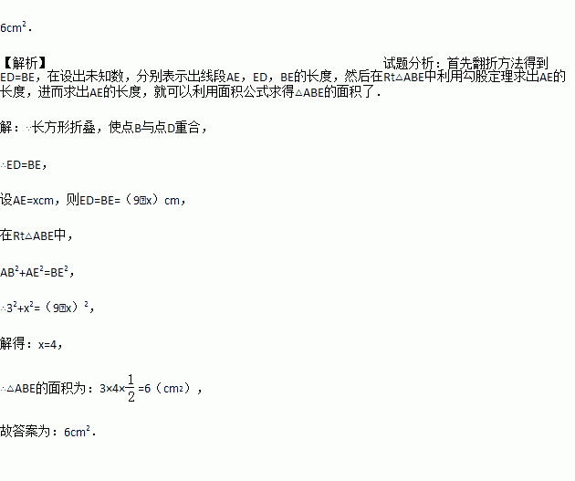 已知,如图:长方形ABCD中,AB=3cm,AD=9cm,将此长方形折叠,使点B与点D重合,折痕为EF,则△ABE的面积为________。