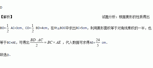 如图,菱形ABCD的对角线AC、BD的长分别是6cm、8cm,AE⊥BC于点E,AE的长是( )