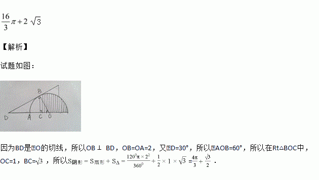 如图,将一块含30°角的直角三角版和半圆量角器按如图的方式摆放 ,使斜边与半圆相切.若半径OA=4,则图中阴影部分的面积为____________.(结果保留π)