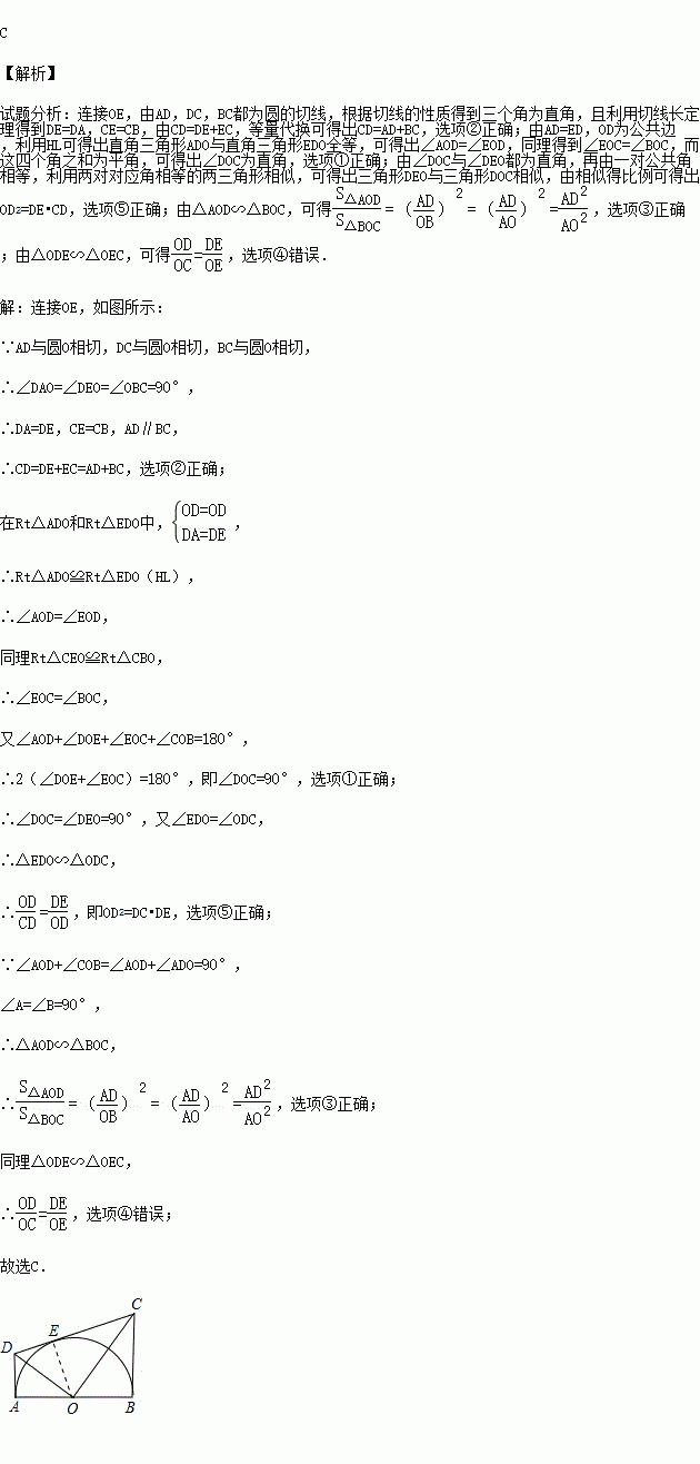 (2015•达州)如图,AB为半圆O在直径,AD、BC分别切⊙O于A、B两点,CD切⊙O于点E,连接OD、OC,下列结论:①∠DOC=90°,②AD+BC=CD,③S△AOD:S△BOC=AD2:AO2,④OD:OC=DE:EC,⑤OD2=DE•CD,正确的有( )