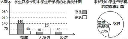 “校园手机”现象越来越受到社会的关注.“五一”期间,小记者刘铭随机调查了城区若干名学生和家长对中学生带手机现象的看法,统计整理并制作了如下的统计图: