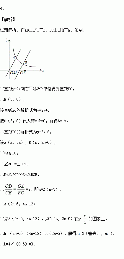 (x>0)交于点A,将直线y=2x向右平移3个单位后,与双曲线y=