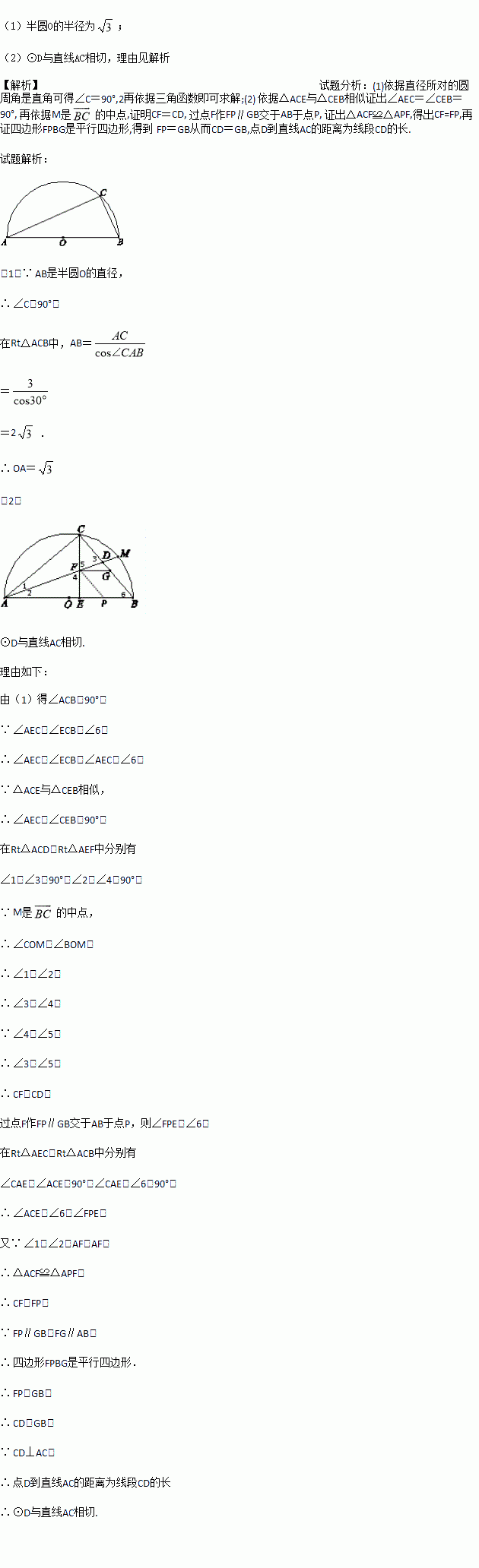 (1)如图1,若AC=3,∠CAB=30°,求半圆O的半径;