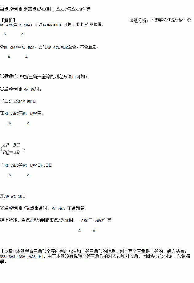 中,∠C=90°,AC=10cm,BC=5cm.一条线段PQ=AB,并且P、Q两点分别在线段AC和过A点且垂直于AC的射线AM上运动.问当P点位于AC的什么位置时由P、Q、A点构成的三角形与