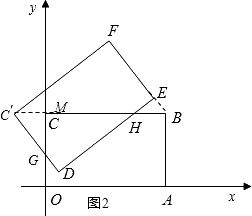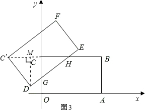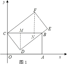分析:(1)根据OA=4,OC=2,BC=OA,因而就可求得BC=2CD,则可以求出∠BCD=60°,则旋转角即可求得;作DM⊥CB于点M,FN⊥CB于点N,根据三角函数即可求得:DM,CM的长,从而求得D的坐标,在Rt△CFN中,根据三角函数即可求得CN,FN的长,即得F的坐标;