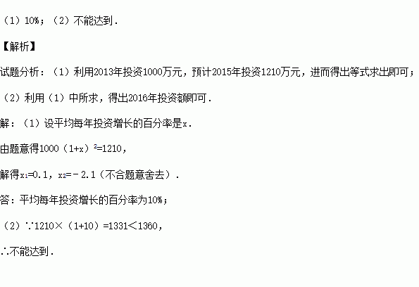 (2)按此增长率,计算2016年投资额能否达到1360万?
