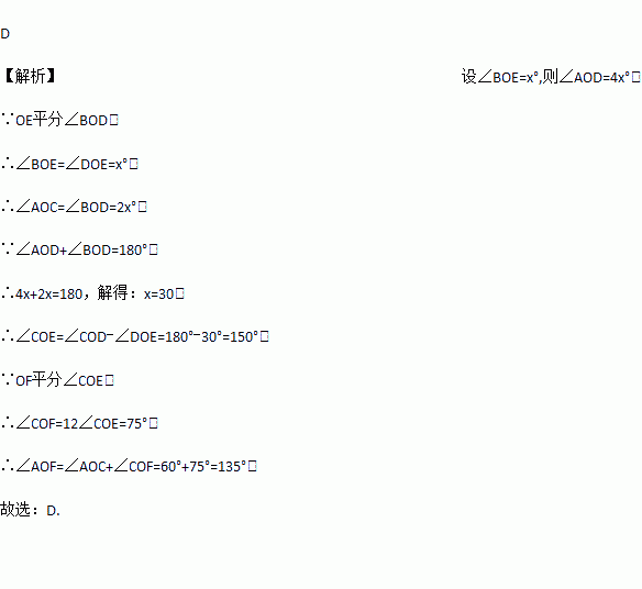 如图,直线AB、CD相交于点O,OE平分∠BOD,OF平分∠COE,∠AOD:∠BOE=4:1,则∠AOF的度数为( )
