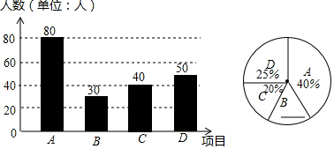 解答 解:(1)根据题意得:80÷40%=200(人),