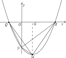 (3)先根据Q、R的坐标求出抛物线的解析式,然后求出N点和M点的坐标,由于抛物线的开口方向不确定,因此分两种情况,由于两种情况解法相同,以开口向上为例说明:由于三角形QNM的面积无法直接求出,因此可将其面积化为其他图形面积的和差来求.过M作MG⊥x轴于G,则三角形QNM的面积可以用梯形QNMG的面积+三角形QON的面积-三角形QMG的面积来得出.然后分别表示出三角形QNM和QNR面积,进行比较即可.