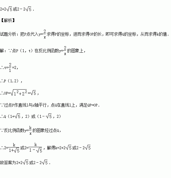 的图象上,过点P作直线l与x轴平行,点Q在直线l上,满足QP=OP.若反比例函数y=