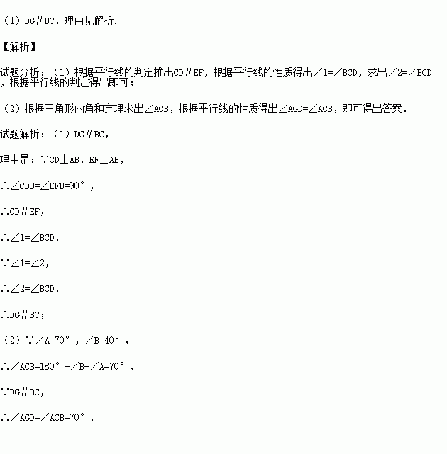(2)若∠A=70°,∠B=40°,求∠AGD的度数。