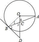 分析:连结OB,根据切线的性质得OB⊥BD,则∠1+∠2=90°,由OD⊥OA得∠AOC=90°,则∠A+∠4=90°,利用∠1=∠A得到∠2=∠4,再根据对顶角相等得∠3=∠4,所以∠2=∠3,然后根据等腰三角形的判定得到DB=BC.
