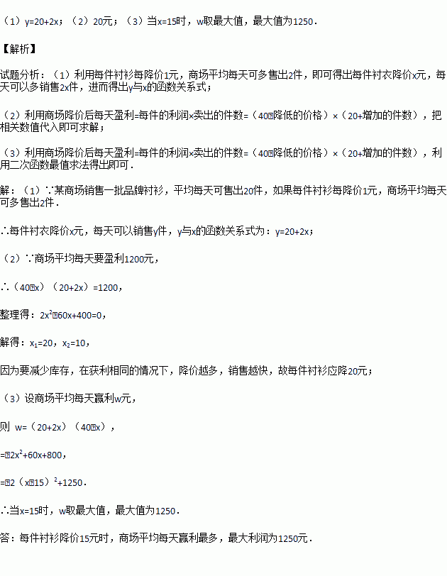 某商场销售一批品牌衬衫,平均每天可售出20件,每件盈利40元,为了扩大销售,增加盈利,尽快减少库存,商场决定采取适当的降价措施,经调查发现,如果每件衬衫每降价1元,商场平均每天可多售出2件.