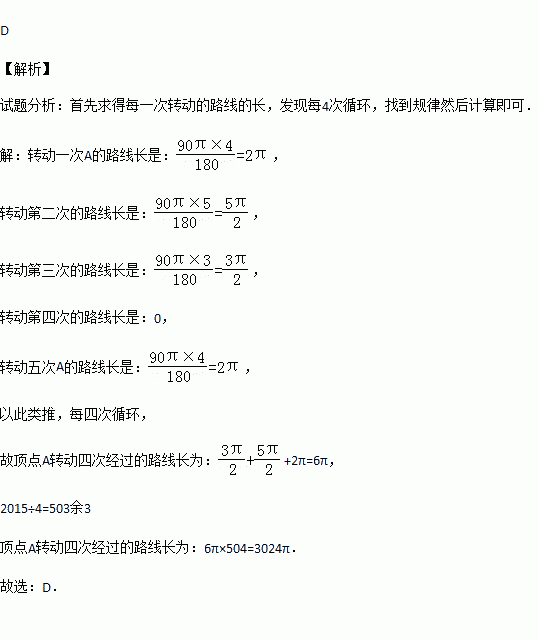 如图,在矩形ABCD中,已知AB=4,BC=3,矩形在直线l上绕其右下角的顶点B向右旋转90°至图①位置,再绕右下角的顶点继续向右旋转90°至图②位置,…,以此类推,这样连续旋转2015次后,顶点A在整个旋转过程中所经过的路程之和是( )