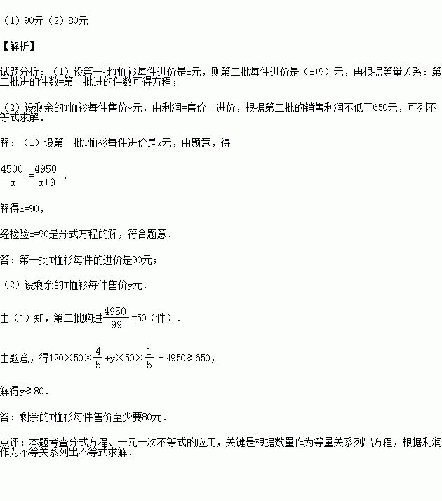 兴发服装店老板用4500元购进一批某款T恤衫,由于深受顾客喜爱,很快售完,老板又用4950元购进第二批该款式T恤衫,所购数量与第一批相同,但每件进价比第一批多了9元.