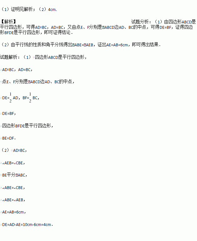 (2)若BE平分∠ABC且交边AD于点E,AB=6cm,BC=10cm,试求线段DE的长.