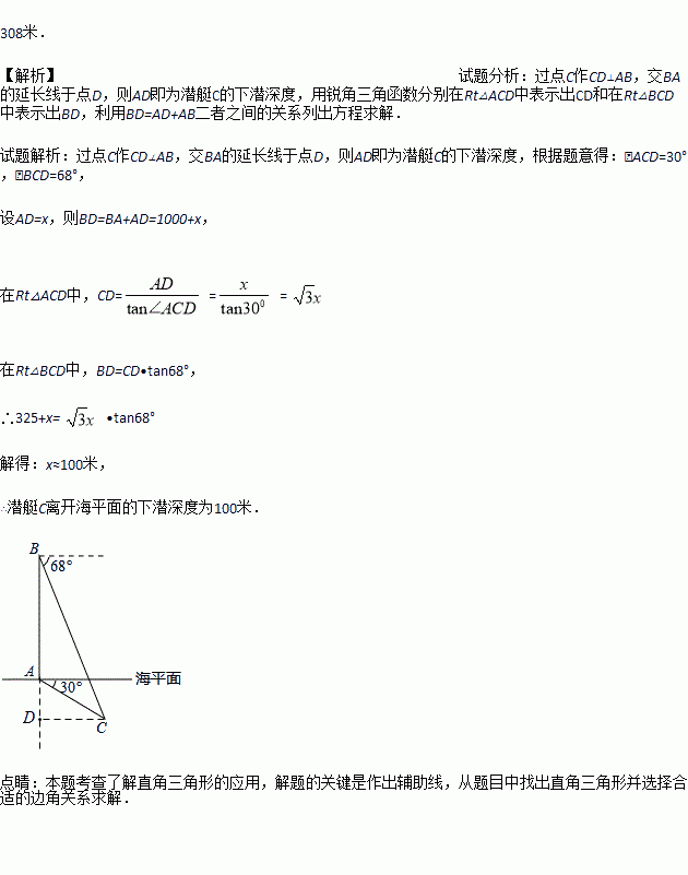 在中俄“海上联合—2014”反潜演习中,我军舰A测得潜艇C的俯角为300.位于军舰A正上方1000米的反潜直升机B侧得潜艇C的俯角为680,试根据以上数据求出潜艇C离开海平面的下潜深度。(结果保留整数。参考数据:sin680≈0.9,cos680≈0.4,,tan680≈2.5.