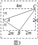 (3)结合(1),(2)易得此三角形的三边分别是直角边长为n,4m的直角三角形的斜边;直角边长为2m,2n的直角三角形的斜边;直角边长为2m,n的直角三角形的斜边.同样把它整理为一个矩形的面积减去三个直角三角形的面积.