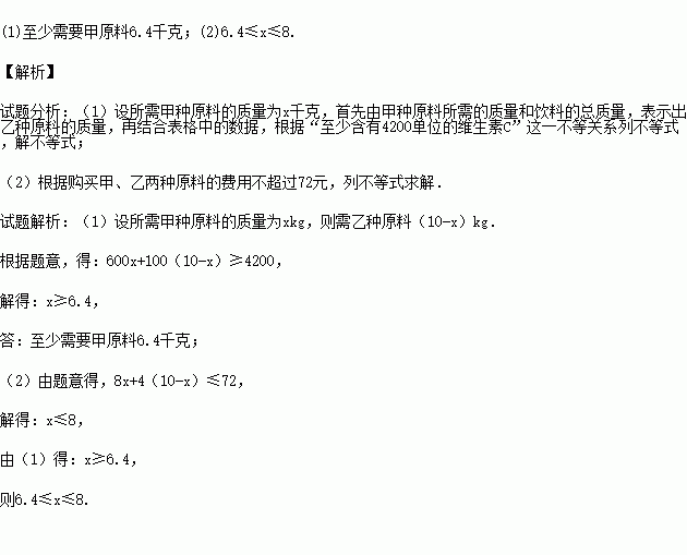 (1)现配制这种饮料10千克,要求至少含有4200单位的维生素C,求至少需要甲原料多少千克?